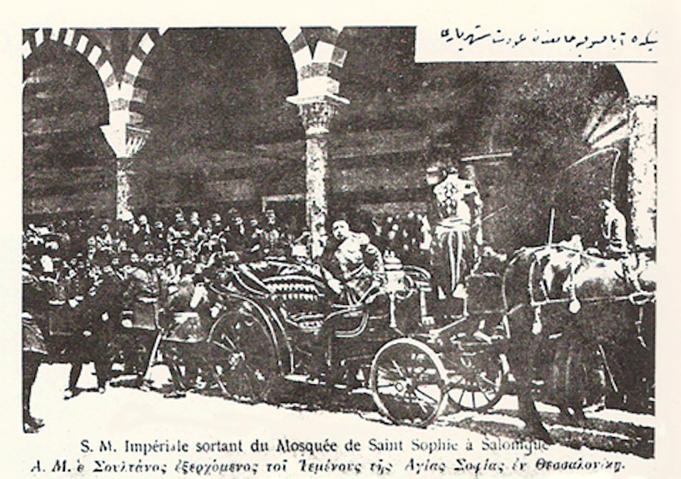 Links: Momentaufnahme der Abreise von Sultan Mehmet V. Resat nach der Pilgerfahrt zur Hagia Sophia in Thessaloniki am 31. Mai 1911.