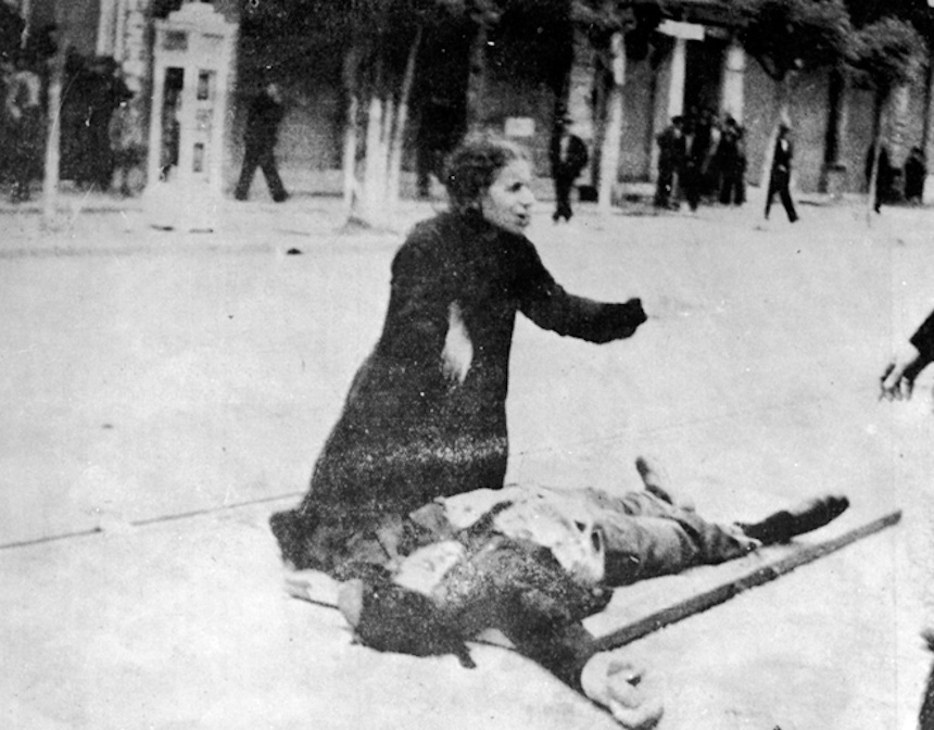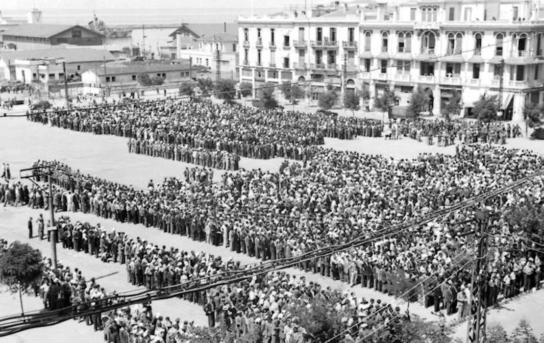 ZwischenkriegszeitIm Jahr 1925 wurde durch die Bemühungen von Alexandros Papanastasiou eine Universität in der Stadt gegründet, die später (1954) zu Ehren des Philosophen Aristoteles in Aristoteles-Universität Thessaloniki umbenannt wurde und heute die größte Bildungseinrichtung Griechenlands ist. Am 3. Oktober 1926 wurde die erste Internationale Ausstellung in Thessaloniki eröffnet.Während der gesamten Zwischenkriegszeit verliehen die sozialen Unruhen, die durch die Aktivierung einer großen Anzahl von Flüchtlingsarbeitern und die Energie jüdischer Arbeiter hervorgerufen wurden, den bereits entwickelten Arbeiterbewegungen der Stadt einen großen Aufschwung. Bereits 1908 wurde unter der Führung von Abraham Benaroya die sozialistische Organisation Federación gegründet, die Pionierarbeit bei der Organisation der Gewerkschaftsbewegung und später bei der Gründung der SEKE/KKE leistete. Anfang der 1930er Jahre und bis zur Errichtung der Diktatur von Ioannis Metaxas kam es in Thessaloniki zu ständigen Demonstrationen und Streiks von Arbeitergruppen wie Tabakarbeitern, Straßenbahnarbeitern und anderen. Die Arbeiterproteste gipfelten im Mai 1936 in der Stadt mit dem großen Streik und der Demonstration der Tabakarbeiter, die von der diktatorischen Metaxas-Regierung blutig niedergeschlagen wurde. Insgesamt gab es zwölf Tote, darunter den 25-jährigen Autofahrer Tasos Tousis (9. Mai 1936), während mehr als 280 Menschen verletzt wurden. Das Foto, das Tasos Tousis' Mutter zeigt, wie sie allein mitten auf der Straße, an der Kreuzung der Straßen Venizelou und Egnatia, um ihn trauert, wurde in der Presse veröffentlicht und diente Yiannis Ritsos als Inspiration für seine Gedichtsammlung „Epitaph“. In der gleichen Zeit entstanden als Reaktion auf die große Präsenz jüdischer Arbeiter mehrere nationalistische/antizionistische Organisationen, die mit verschiedenen Problemen zu kämpfen hatten. Das wichtigste dieser Probleme war die Brandstiftung an Campbell, einem jüdischen Slum in Kalamaria, am 29. Juni 1931.