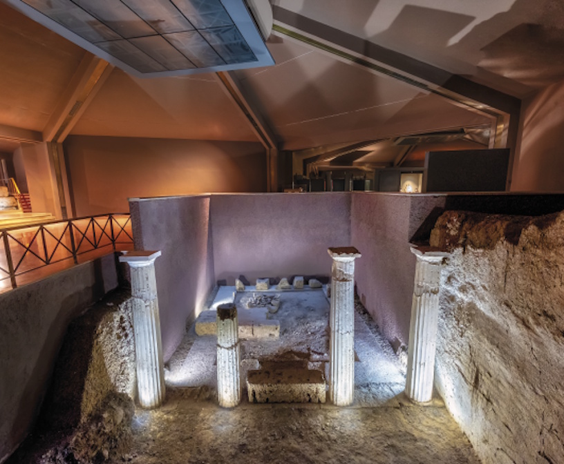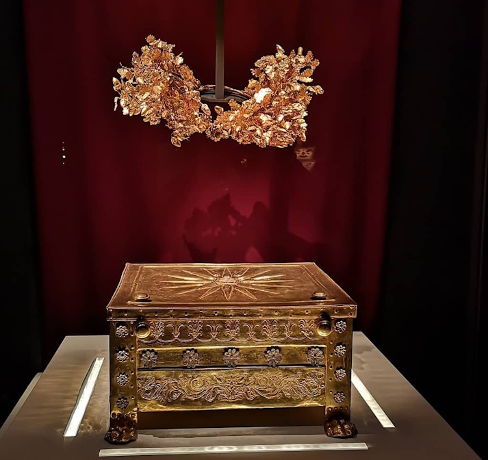 Das Museum und die ExponateDer Eintritt zur archäologischen Stätte von Vergina und zum Museum der Königlichen Gräber ist am 6. März, frei, dem Tag, der dem Andenken an Melina Mercouri gewidmet ist.Eine große Anzahl von Grabbeigaben, die Kunstwerke sind oder den Wert von Kunstwerken haben, wurden aus den Gräbern geborgen, viele davon aus Gold, wie die berühmte Urne mit den verbrannten Überresten Philipps II., die das sechzehnstrahlige Sonnen- (oder Stern-)Symbol der makedonischen Dynastie trägt, und die kleinere Urne mit dem zwölfstrahligen Stern und den Kränzen aus Eichenblättern und -früchten. Alle Fundstücke befinden sich im Museum, das 1993 eröffnet wurde und so gebaut wurde, dass es die Grabstätten umschließt und schützt, die Exponate hervorhebt und den wieder aufgefüllten Hügel zeigt, wie sie vor den Ausgrabungen war. Im Inneren befinden sich vier Gräber und ein kleines Heiligtum, das Heroon. Die beiden bedeutendsten Gräber, die von Philipp II. und Alexander IV., waren nicht geplündert worden und enthielten die wichtigsten Schätze des Museums.