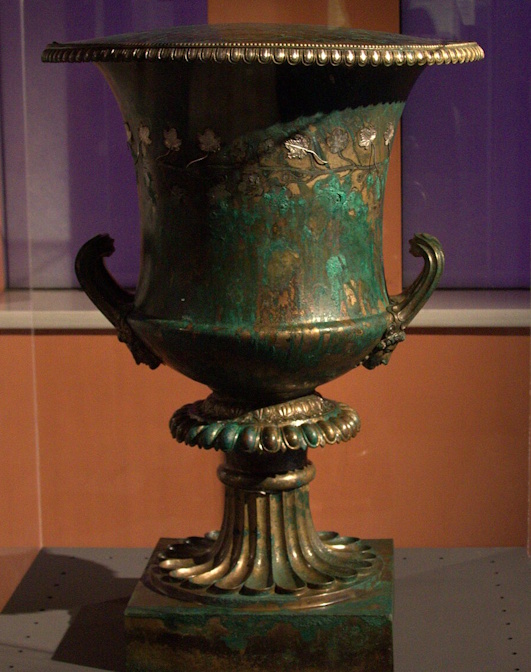 Αριστερά: Χάλκινος καλυκωτός κρατήρας, έργο μακεδονικού εργαστηρίου. Περίπου 370 π.Χ.
